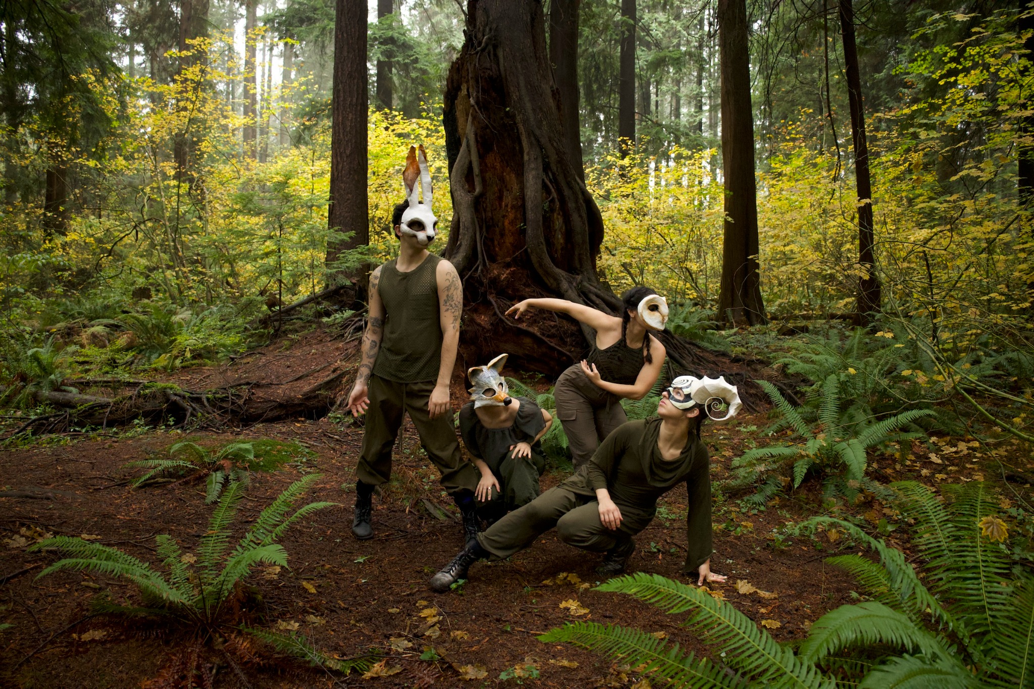 Dow's choreography, marked by its heartfelt, breath-filled, feel-good movements, feels very grounded and fully resonates with each dancer. The dancers don white masks of different animals (as pictured). With each new song by Reznek, we are met with a new ambience and choreographic aesthetic, always shifting between different solos, duets, trios, and full ensembles.